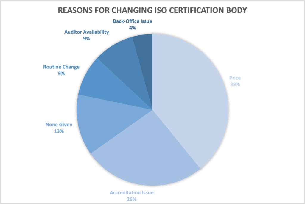 The number one reason organisations want to change their certification body is because of price. Either prices have risen at their current certification body or market pressure have led them to seek comparative and competitive costs.